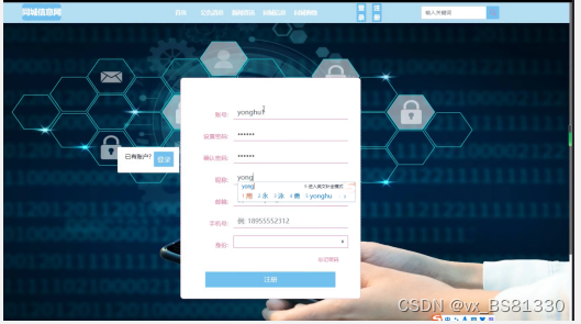 在系统首页注册,用户在前台页面注册信息:用户名、密码、姓名、性别、出生年月、邮箱、手机、身份证、头像、地址、备注等内容,如图5-6所示: