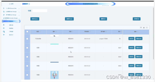 同城信息,在同城信息管理页面查看标题、图片、类型、发布时间、用户编号、姓名、详情介绍等信息,并可在同城信息查询页面对已有的同城信息进行编辑删除详细等操作,如图5-4所示: