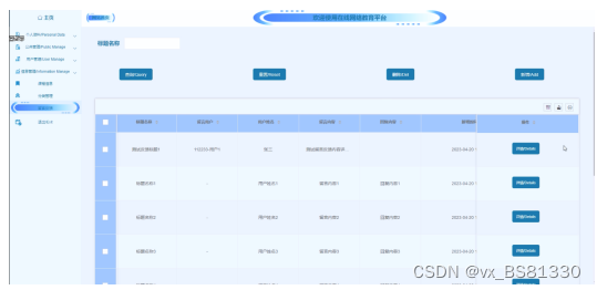 (6)留言反馈:管理员点击“留言反馈”会显示出所有的留言反馈信息,支持通过标题名称或者留言用户或者用户姓名对留言反馈信息进行查询,如果想要添加新的留言反馈信息,点击“添加”按钮,输入相关信息,点击“提交”按钮就可以添加了,同时可以选择某一条留言反馈信息,点击“删除”进行删除。