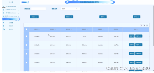 (5)课程信息:管理员点击“课程信息”会显示出所有的课程信息,支持输入课程名称或者课程分类对课程信息进行查询,如果想要添加新的课程信息,点击“添加”按钮,输入课程编号、课程名称、课程分类、课程时长、课程视频、课程资料等信息,点击“提交”按钮就可以添加了,同时可以选择某一条课程信息,点击“删除”进行删除,也可以对用户提交的课程信息评论的信息进行管控;