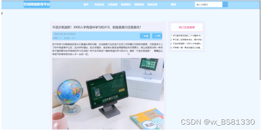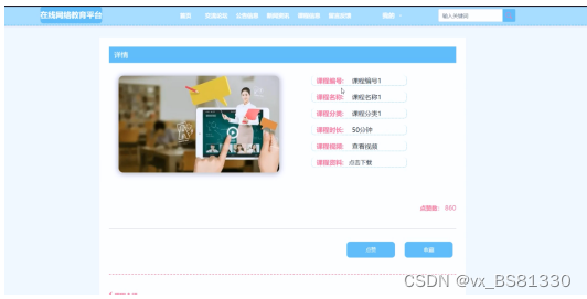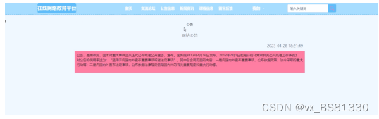 This design mainly implements an online online education platform that combines the advantages of humanization, efficiency, and convenience. It completes functional modules such as personal information (personal information, password modification) public management (broadcast images, announcement information) user management (administrators, system users) information management (communication forums, forum classification, news information, news classification) course information, classification management, message feedback, etc. The system communicates with the server through a browser to achieve data interaction and changes. You only need to use a computer and move your fingers to operate the system, achieving data communication management. The entire system design process fully considers issues such as data security, stability, and reliability, and the operation process is simple. This system improves work efficiency and reduces errors and omissions in data storage through scientific management and convenient services.