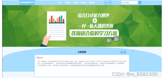 (2)查看在线网络教育平台的首页信息:在线网络教育平台的首页信息包含了首页、交流论坛、公告信息、新闻资讯、课程信息、留言反馈、我的(我的账户、我的收藏、个人中心)。