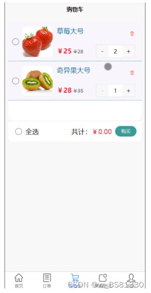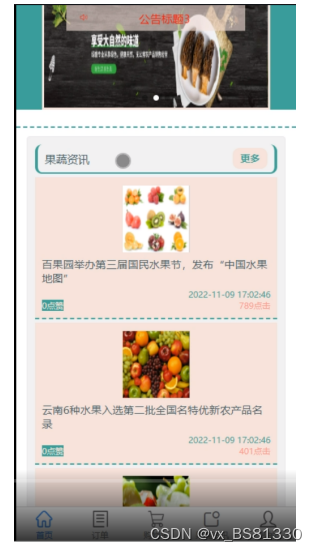 用户登录前台可查看首页、订单、购物车、果蔬资讯、我的等功能,并可进行相应的操作,如图5-9所示。