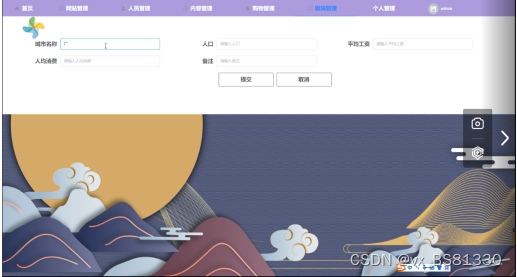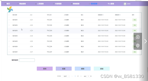 城市信息管理,在城市信息管理页面中可以对城市名称、人口、平均工资、人均消费、备注等信息进行添加,还可在信息查询页面进行修改或删除详细等操作,如图5-7所示。