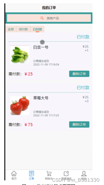 我的订单,在我的订单页面中可以查看到全部订单,待付款、已付款的订单等信息也可对订单进行修改删除详细等操作,如图5-10所示。