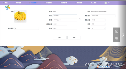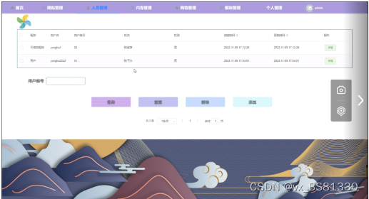 人员管理,在人员管理页面中可以对昵称、用户名、用户编号、姓名、性别、密码、邮箱、邮箱认证、手机号码、手机认证、状态等信息进行添加,还可在已有的人员里查询页面进行修改或删除等操作,如图5-4所示。