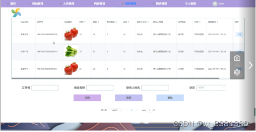 订单列表管理,在订单列表管理页面中可以对商品名称、订单号、商品图片、价格、原价、购买数量、总价、联系人名称、联系人地址、订单状态、买家、等信息进行添加,还可在列表中查询页面详情、修改或删除等操作,如图5-6所示。