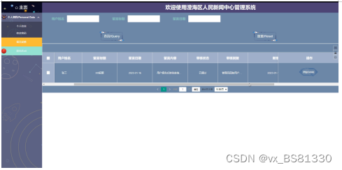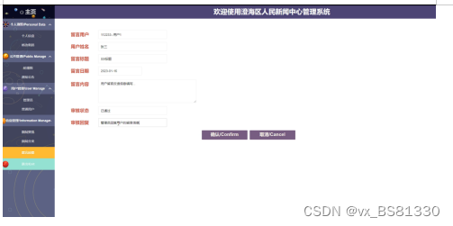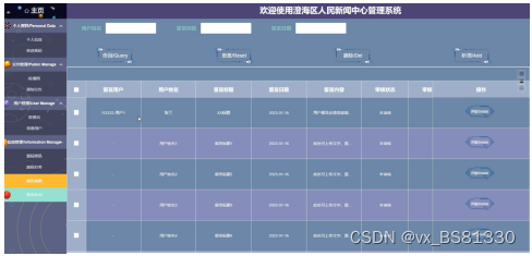 留言反馈管理,管理员在此页面可以查看留言用户,姓名,标题,日期,留言内容信息,并可根据需要进行审核回复,查询,重置,删除,新增等操作,如图5-9,5-10所示。
