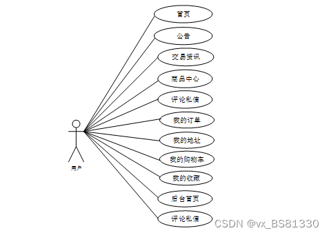 通过2.3功能的分析,得出了本二手校园交易平台的用例图: