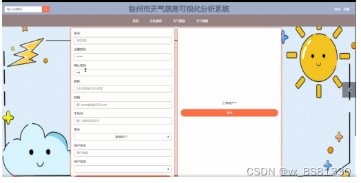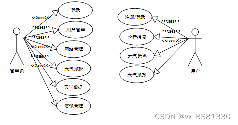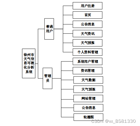 天气信息可视化分析系统的功能主要分为前台用户根据自己的需求进行注册登录,浏览天气信息并对选中的天气进行搜索操作。后台系统管理员因职责的不同,管理员主要对注册用户,天气预报、天气数据进行处理。