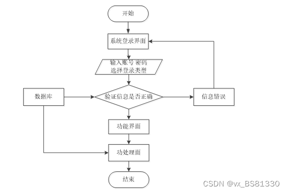 用户想进入系统,首先进入系统登录界面,通过正确的用户名、密码,选择登录类型登录,系统会检查登录信息,信息正确,然后输入相应的功能界面,提示信息错误,登录失败。系统操作流程如图3-4所示。