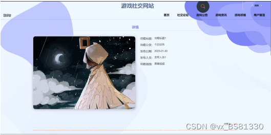 当访客点击了任意游戏攻略后将会进入该攻略的详情界面,可以了解到该游戏攻略的攻略标题、攻略分类、发布日期、发布人员、攻略视频等,同时可以对该游戏攻略进行收藏+点赞+评论,游戏攻略详情展示页面如图4-6所示。