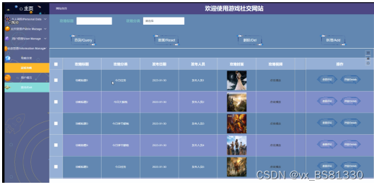 (6)游戏攻略:点击“游戏攻略”这个按钮可以查看到所有游戏攻略信息,支持通过攻略标题或者攻略分类或者发布日期进行查询游戏攻略信息,可以对游戏攻略进行添加、删除、查看游戏攻略信息的详细内容;