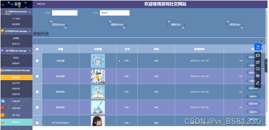 (4)信息模块管理:当点击“信息管理”这一菜单的时候,会出现社交论坛+论坛分类+游戏资讯+资讯分类这四个子菜单,能够对用户在前台提交的社交论坛进行管理,同时对前台展示的游戏资讯信息进行增删改查操作;