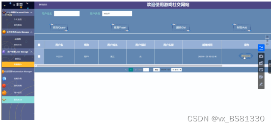 游戏社交网站中的管理人员是可以对前台注册的用户进行管理的,也可以对管理员进行管控。界面如下图4-8所示。