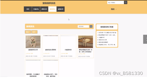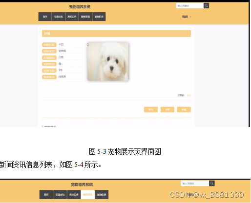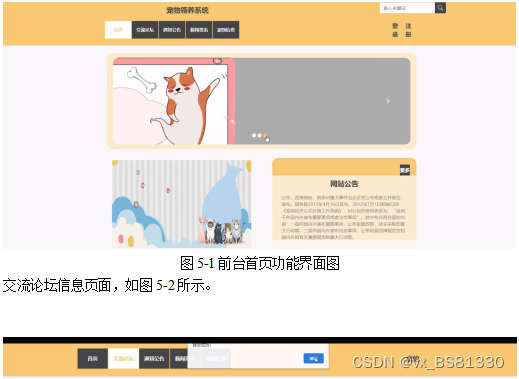 宠物领养系统,在系统首页可以查看网站首页、交流论坛、通知公告、新闻资讯、宠物信息等内容,如图5-1所示。