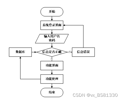 用户打开并进入系统后,会先显示登录界面,输入正确的用户名和密码,系统自动检测信息,若信息无误,则用户会进入系统功能界面,进行操作,否则会提示错误无法登录,操作流程如图3-3所示。