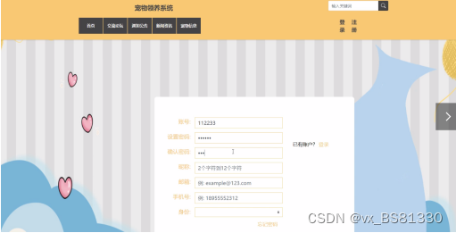 用户登录进入宠物领养系统可以填写个人信息进行用户注册等内容。如图5-9。