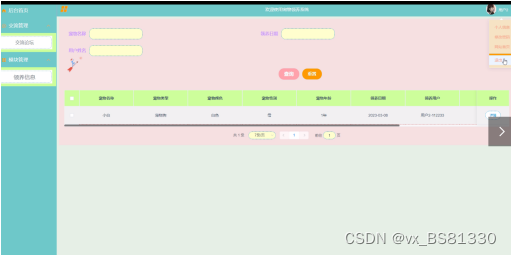 领养信息,在领养信息页面可以查看宠物名称、宠物类型、宠物颜色、宠物性别、宠物年龄、领养日期、领养用户等信息进行详细操作。如图5-11。