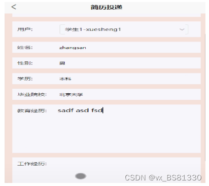 简历投递模块:学生用户可以在线进行个人简历的投递,企业用户后台可以查看到学生的投递具体信息,管理员主要对简历投递进行维护管理操作。