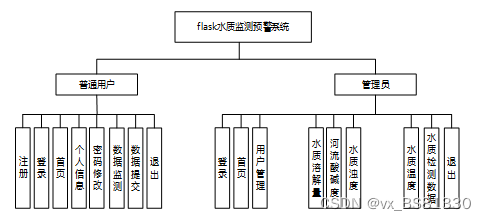水质监测预警系统总体分为注册用户模块,管理员模块。