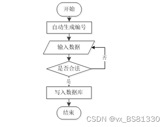 用户成功登入系统后就能够实现增加数据的操作,增加数据的编号是特定的,系统生成,用户不能随意填写,除了编号以外,其他增加信息用户自己填写,填写后的信息经过系统验证,验证合法通过就显示增加数据成功了,相反的话,就没有增加成功,图2-1显示的就是在增加数据时的流程。