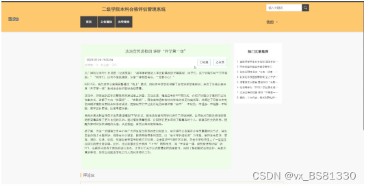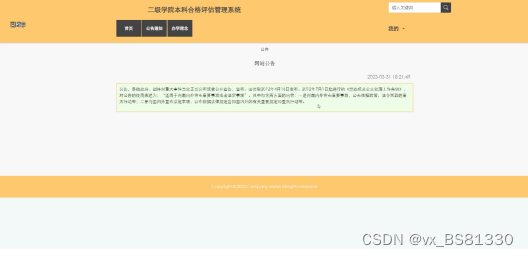 This design mainly realizes the undergraduate qualification evaluation management system of the secondary college which integrates the advantages of humanization, efficiency and convenience System users (administrator, dean user, deputy dean, department head, teacher user) resource management (school philosophy, news classification) announcement notice management (announcement notice) module management (teacher information, document information, evaluation materials, material classification, material information, group leader review, director review, deputy dean review, dean review, conventional material archiving, assessment material archiving, teaching material archiving) and other functional modules. The system communicates with the server through the browser to realize data interaction and change. The system improves work efficiency and reduces errors and omissions in data storage through scientific management and convenient services. The undergraduate qualification evaluation management system of the secondary college uses Java language, uses SSM technology based on MVVM mode for development, and uses Eclipse 2017 CI 10 compiler for compilation. In terms of data, it mainly uses Microsoft's MySQL relational database as the data storage medium, and cooperates with the previous HTML+CSS technology to complete the system development.