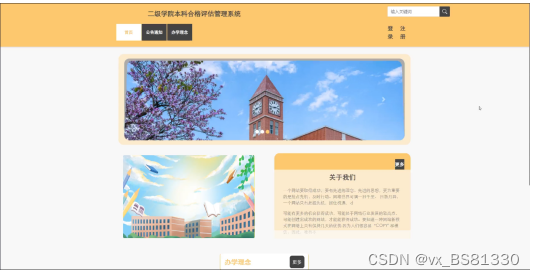 (2)查看二级学院本科合格评估管理系统的首页信息:二级学院本科合格评估管理系统的首页信息包含了首页、公告通知、办学理念、我的(我的账户、我的收藏、个人中心)等。