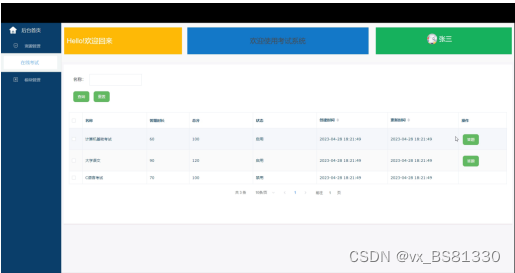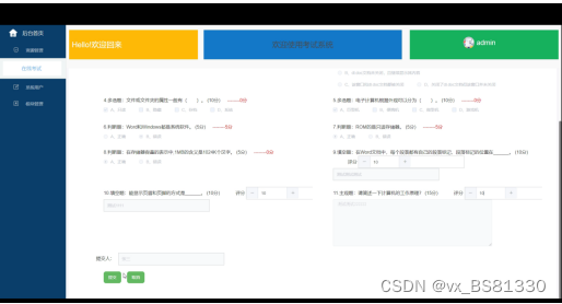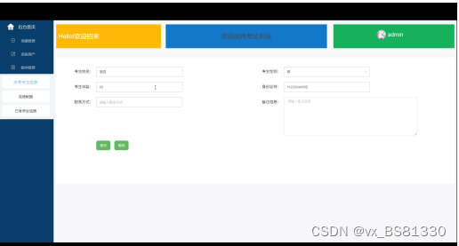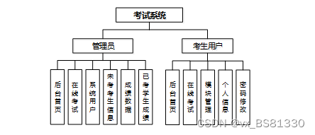 考试系统的主要使用者分为管理员和考生用户,实现功能包括后台首页,在线考试,系统用户(管理员,考生用户),模块管理(未考考生信息,成绩数据,已考考生成绩)等功能。