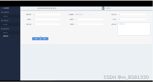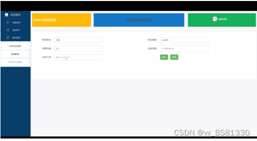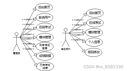 The main users of the exam system are divided into administrators and candidate users, and the implementation functions include the backend homepage, online exams, system users (administrators, candidate users), module management (information of candidates who have not taken the exam, score data, and scores of students who have taken the exam), and other functions.