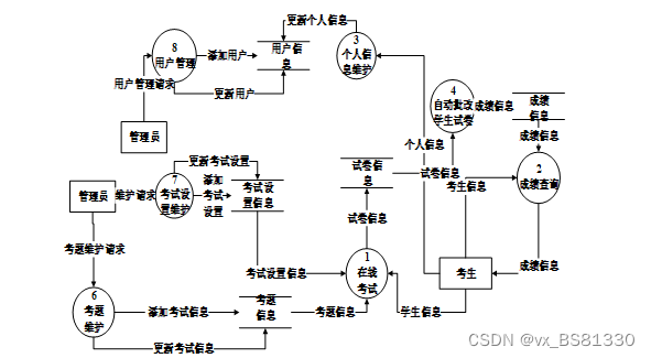 对系统的数据流进行分析,系统的使用者分为二类,考生用户,管理员。系统主要对界面信息传送,登录信息的验证,注册信息的接收,用户各种操作的响应做处理。