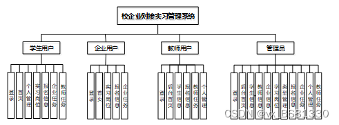 (1)功能要求:首页、个人管理、人员管理(学生用户、教师用户、企业用户、管理员)模块管理(学生信息、教师信息、企业信息、学习岗位、类型管理、报名信息、企业任务、教师任务)等功能模块。