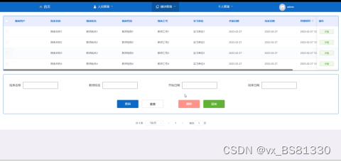 教师信息:管理员在这一栏可以通过搜索查看教师用户、教师姓名、教师性别、教师工号、实习单位等详细描述信息。可以进行查询、重置、删除、添加等操作,如图5-7,5-8所示。