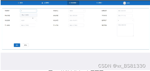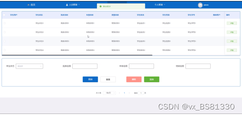 学生信息:管理员在这一栏可以通过搜索查看学生用户、学生姓名、学生状态、院系名称、年级名称、班级名称等详细描述信息。可以进行查询、重置、删除、添加等操作,如图5-5 5-6所示。