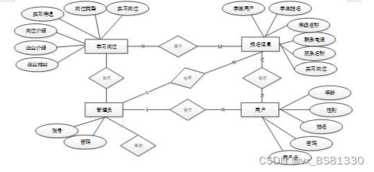 通过校企对接实习管理系统的功能进行规划分成几个实体信息,实体信息将通过ER图进行说明,本系统的主要实体图如下: