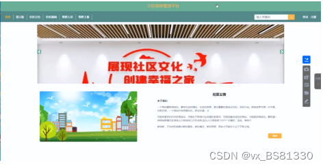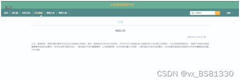 (3)社区公告:在首页导航栏上我们会看到“社区公告”这一菜单,我们点击进入进去以后,会看到所有管理员在后台发布的公告信息;