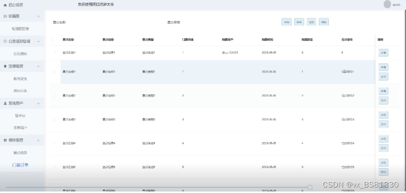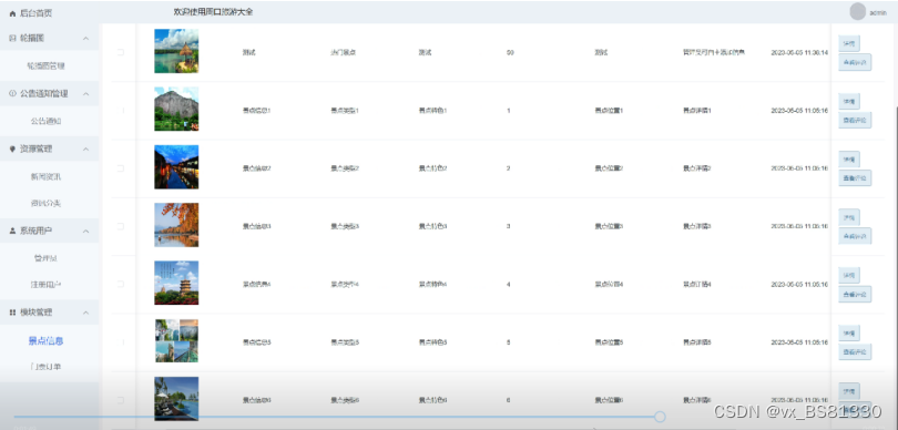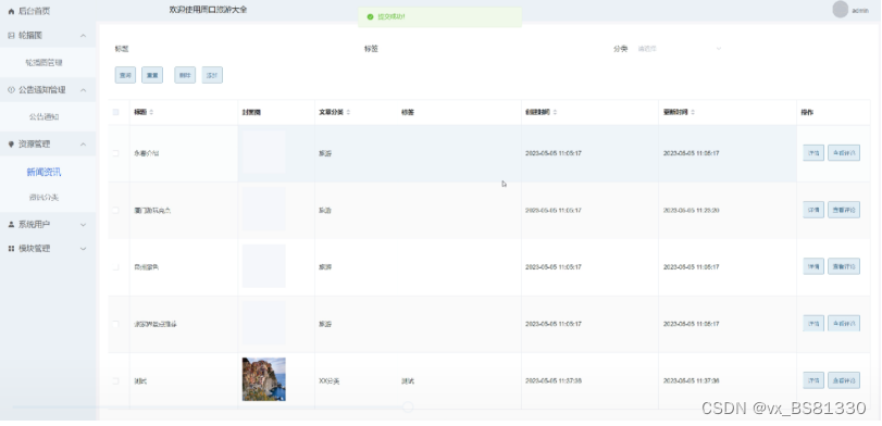 - 轮播图与通知公告管理:管理员可以对系统前台展示的轮播图以及公告进行增删改查,方便用户进行查看。