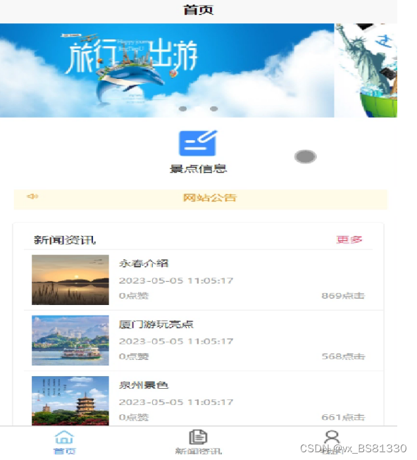 (2)查看周口旅游大全微信小程序的首页信息:周口旅游大全微信小程序的首页信息包含了首页、公告通知、新闻资讯、景点信息等。