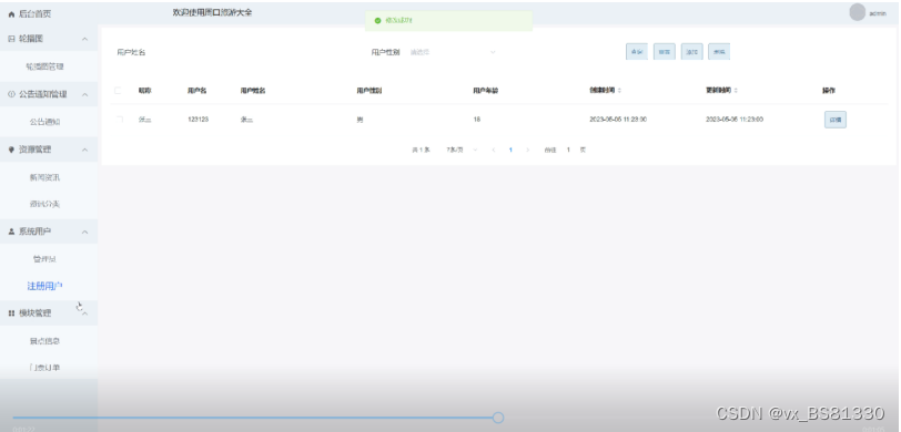 (2)系统用户管理:管理员可以对周口旅游大全微信小程序中的管理员及普通用户进行增删改查。