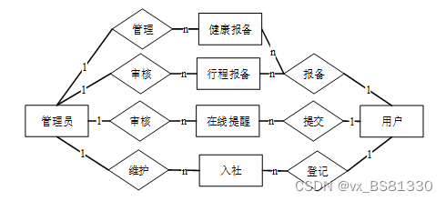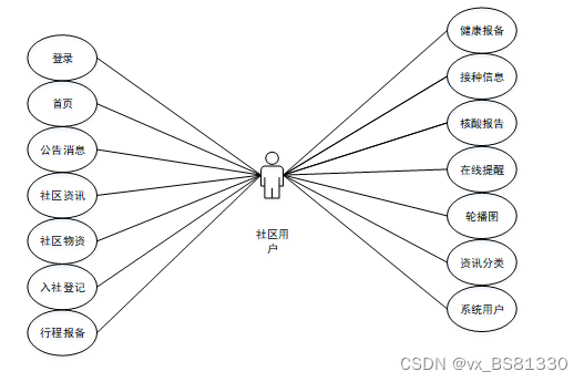 社区疫情防控管理系统的功能主要分为前台用户根据自己的需求进行注册登录,浏览检测机构信息并对选中的检测机构进行核酸预约操作。后台系统管理员因职责的不同,管理员主要对注册用户,入社登记、行程报备、健康报备、家庭成员、接种信息、核酸报告、在线提醒等进行处理。
