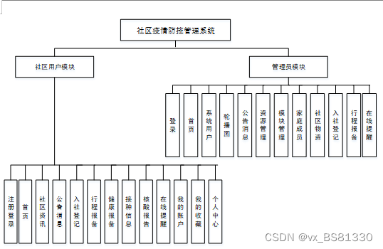 社区疫情防控管理系统总体分为前台用户模块和后台管理员模块。