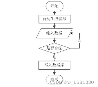用户成功登入系统后就能够实现增加数据的操作,增加数据的编号是特定的,系统生成,用户不能随意填写,除了编号以外,其他增加信息用户自己填写,填写后的信息经过系统验证,验证合法通过就显示增加数据成功了,相反的话,就没有增加成功,图2-1显示的就是在增加数据时的流程。