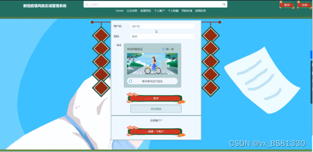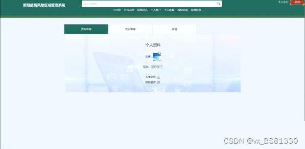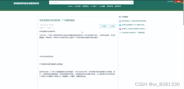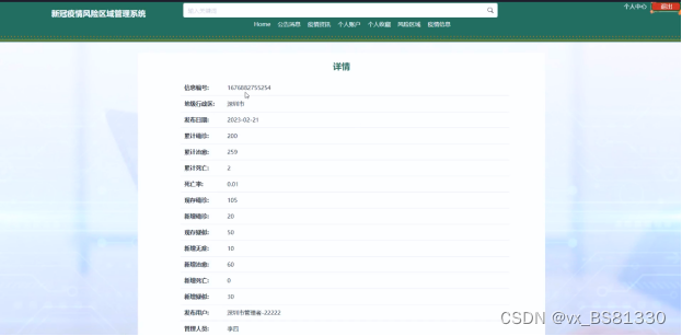 (2)查看新冠疫情风险区域管理系统的首页信息:新冠疫情风险区域管理系统 的首页信息包含了首页、公告消息、疫情资讯、个人账户、个人收藏、风险区域、疫情信息、个人中心。