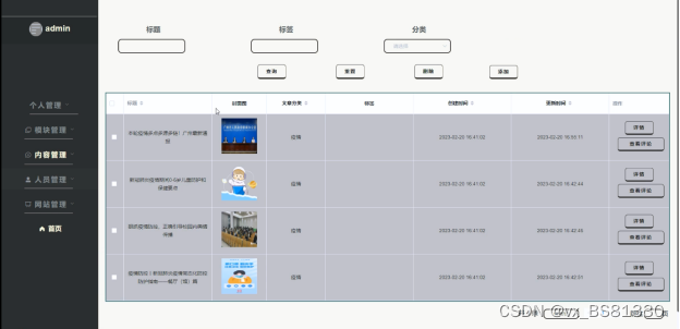(3)内容管理:管理员可以对新冠疫情风险区域管理系统前台展示的疫情资讯以及资讯分类进行管控。