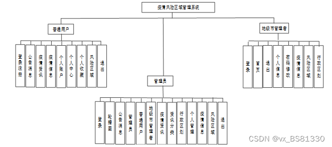 新冠疫情风险区域管理系统划分为了普通用户模块、地级市管理者和管理员模块这三大部分。