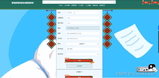 (1)用户注册登录:游客可以随时进入到系统中,对系统中的信息浏览,但是想要实现风险区域以及疫情信息等操作,就必须有这个系统的账号,如果没有账号的话,可以注册以后进行相关的操作,同时用户还可以通过“个人账户”这以按钮对个人信息以及操作的信息进行管控。
