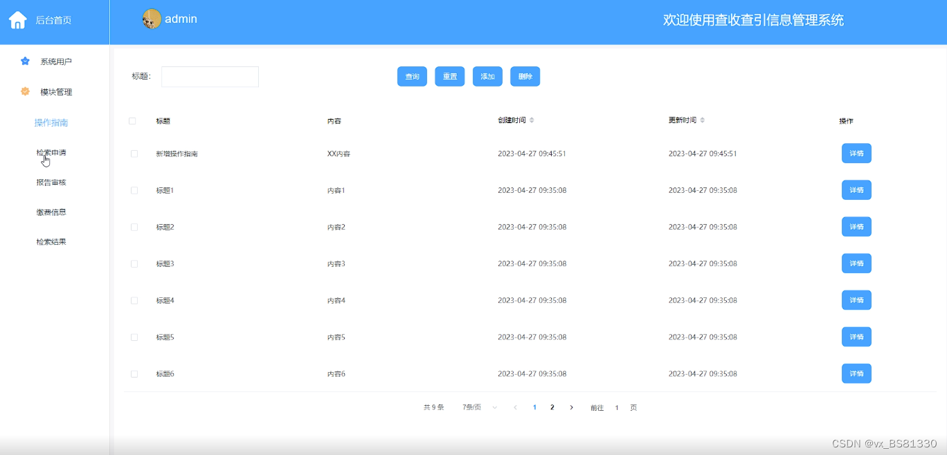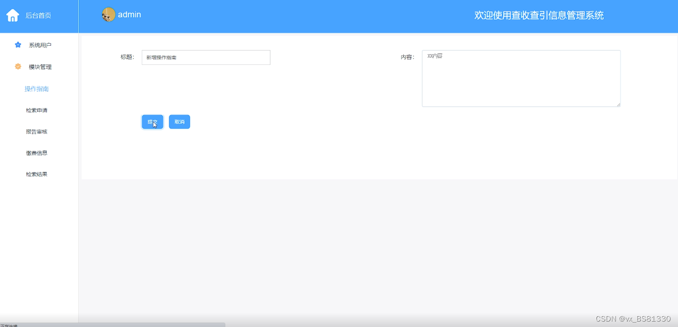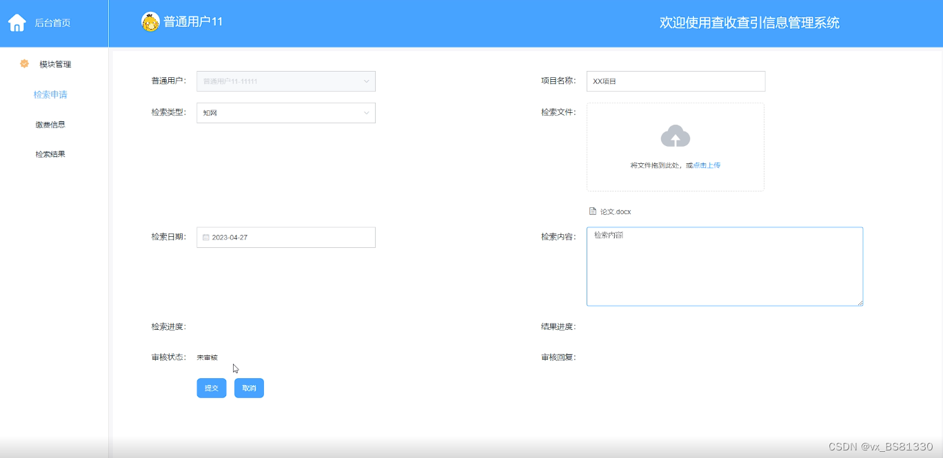 This design mainly implements a retrieval and citation information management system that combines the advantages of humanization, efficiency, and convenience. It completes functional modules such as system user management, operation guide, retrieval application, report review, payment information, and retrieval results. The system communicates with the server through a browser to achieve data interaction and changes. You only need to use a computer and move your fingers to operate the system, achieving data communication management. The entire system design process fully considers issues such as data security, stability, and reliability, and the operation process is simple. This system improves work efficiency and reduces errors and omissions in data storage through scientific management and convenient services.