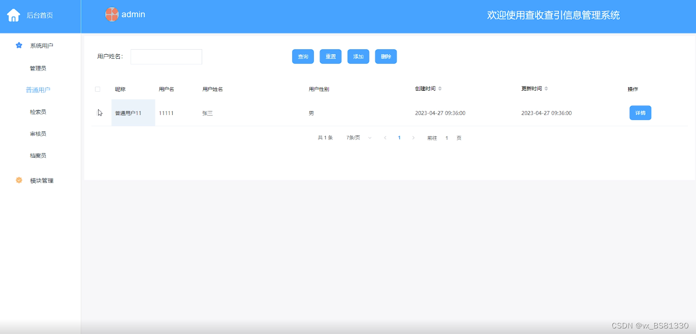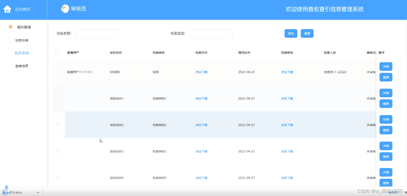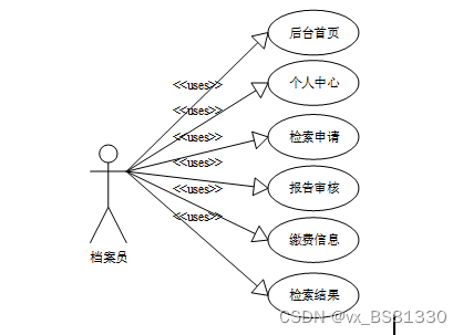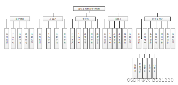 查收查引信息管理系统在对需求做解析后,整个系统主要分为五个部分:用户、检索员、审核员、档案员和管理员,每个模块下的分支功能不一样。对功能做出如下说明: