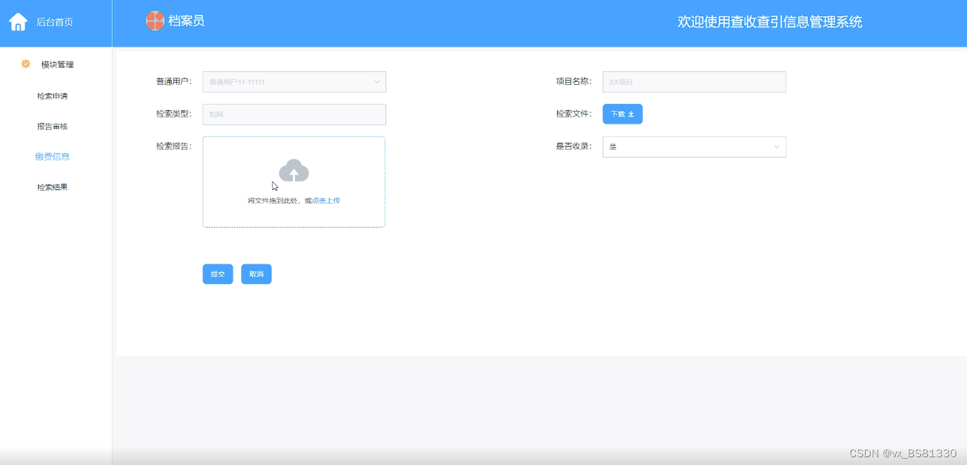 档案员根据用户的缴费信息,通过检索申请页面下载搜索报告,盖章后再发送报告至用户检索结果处。同时档案员可以选择对此次检索结果进行收录与否。