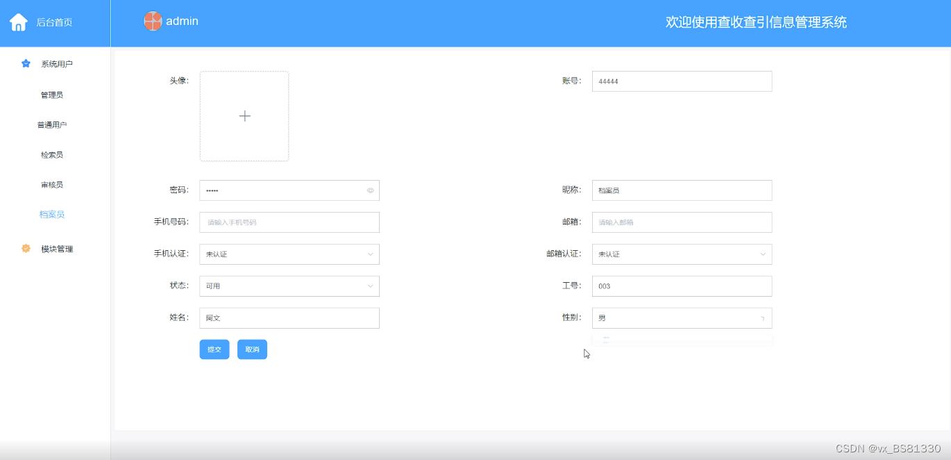 对普通管理员、检索员、审核员、档案员账号进行添加、维护操作。
